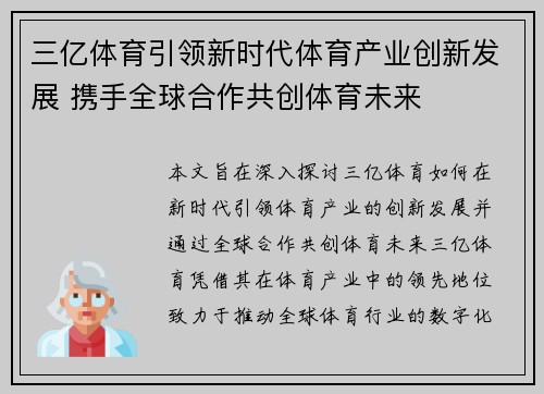 本文旨在深入探讨三亿体育如何在新时代引领体育产业的创新发展,并通过全球合作共创体育未来。三亿体育凭借其在体育产业中的领先地位,致力于推动全球体育行业的数字化转型与跨领域创新,通过科技、文化、市场及社会责任四个方面的持续创新与优化,助力全球体育产业的多维发展。本文将从这四个方面逐一展开阐述,具体分析三亿体育如何带领全球体育行业进入一个更加多元、创新、共赢的新时代。