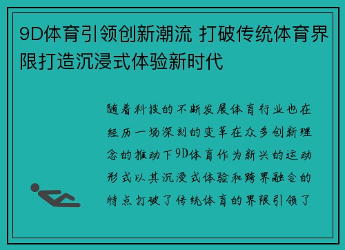 随着科技的不断发展,体育行业也在经历一场深刻的变革。在众多创新理念的推动下,9D体育作为新兴的运动形式,以其沉浸式体验和跨界融合的特点,打破了传统体育的界限,引领了行业的创新潮流。9D体育不仅仅是一项简单的运动,而是将虚拟现实(VR)、增强现实(AR)等技术与传统体育相结合,创造出一种全新的互动体验。在这篇文章中,我们将从多个角度深入探讨9D体育如何通过技术创新和沉浸式体验打破传统体育的界限,推动体育产业向未来发展,并展望其可能带来的巨大影响。