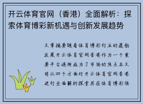 随着体育博彩行业的蓬勃发展,开云体育官网(香港)作为一个重要平台,逐渐成为了市场的焦点。本文将从四个方面对开云体育官网(香港)进行全面解析,探索其在体育博彩领域的创新机遇与发展趋势。首先,我们将探讨开云体育官网(香港)在体育博彩市场中的地位与影响力,分析其如何通过先进的技术手段与策略获得竞争优势。其次,分析开云体育官网(香港)如何利用数字化转型推动平台的多元化发展,包括人工智能、大数据等技术的应用。第三,重点讨论开云体育官网(香港)在合规性与监管环境中的应对策略,确保其在合法合规的框架内稳定运营。最后,文章将展望体育博彩行业的未来发展趋势,并分析开云体育官网(香港)如何在全球化与本地化的双重挑战中找到突破口。通过这些分析,我们将全面了解开云体育官网(香港)如何在激烈的竞争中脱颖而出,拓展体育博彩的新机遇。文章总结部分将回顾全文要点,进一步思考其未来发展路径。